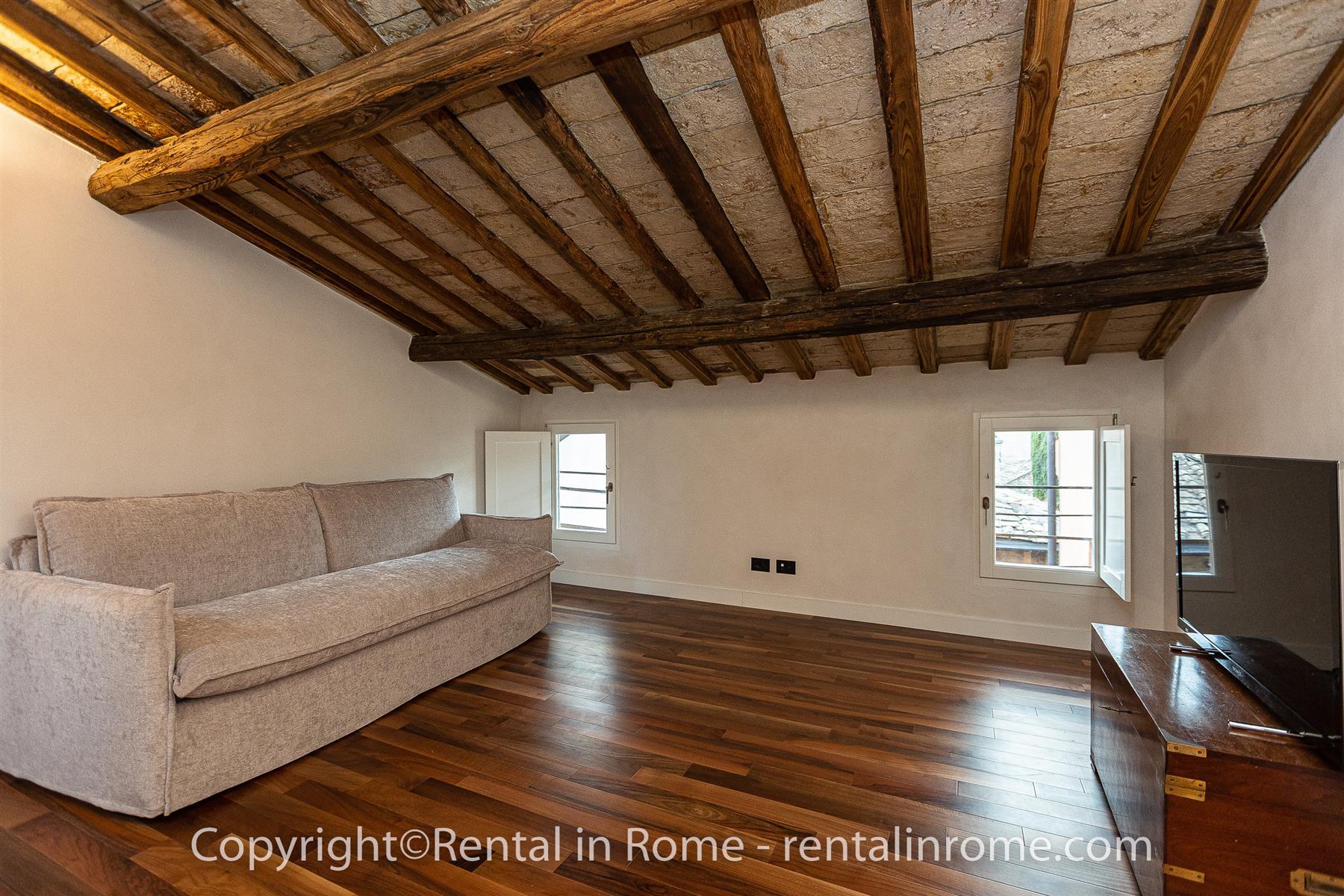 The apartment is located on the 2nd floor without lift of an ancient building in the historic center and consists of a dining area with table and chairs and a splendid and modern kitchen equipped with all supplies, followed by a double bedroom and a bathroom. with shower. On the second level, accessible via an internal staircase, we find a room that can be used as a TV room and living room or bedroom with a high quality double sofa bed, this floor is completed by a comfortable service bathroom. From the windows it is possible to enjoy the magnificent view over the rooftops of Rome.