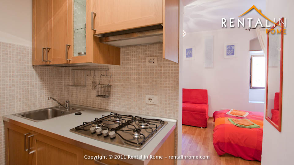 Spend your holiday in Rome in this beautiful and characteristic apartment located in Vicolo di Montevecchio, just a few steps away from Piazza Navona and Campo de' Fiori. This vacation apartment, available for short and long term rentals, is on the first floor, without elevator, of a building belonging to the 14th century. It is composed by a small living room with a double sofa bed and a dining corner, a completely equipped kitchen, a bathroom with shower. It is furnished with air conditioner and satellite TV. Modern furniture and good quality soft-furnishings complete this marvellous Rome vacation rental.