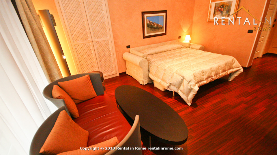 Beautiful luxury accommodation located on Via Cavour, a few steps away from the Imperial Forum and the Colosseum, in the heart of Rome. This luxury apartment-suite has been recently renovated by a renowned architect and it is located on the 1st floor of an ancient building, which is protected by the Italian Ministry of Culture. It is comprised of an open space with a double bed, a sitting area with sofas, a dining area, a fully equipped kitchen and a precious marble bathroom with a bathtub. Features air conditioning, satellite TV (Sky and Cinema) with a DVD player, a telephone, Internet connection and a video entry phone. Its modern, high-quality furnishings and dècor complement this very elegant accommodation.