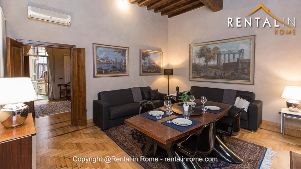 Appartement de luxe situé Via dei Coronari, à deux pas de Place Navona, de Campo de' Fiori et du Panthéon. L'appartement est situé au 1er étage sans ascenseur d'un immeuble ancien du centre historique. L'appartement se compose d'un grand salon avec des canapés et une table de représentation, la propriété se caractérise par de hauts plafonds recouverts de poutres en chêne. Le salon mène à la première chambre double, suit une salle de bains avec baignoire, une cuisine moderne équipée avec une table pour six personnes, à partir de là vous trouverez la deuxième chambre double avec salle de douche attenante. L'appartement dispose d'une belle terrasse avec gazebo et canapés, espace idéal pour profiter de moments de détente en plein air. La propriété est équipée de la climatisation dans toutes les chambres, d'une télévision connectée, d'une connexion Internet, d'un four micro-ondes, d'un lave-vaisselle et d'un lave-linge. La décoration classique, les hauts plafonds en bois et sa position stratégique font de cet établissement un excellent choix pour un séjour inoubliable au cœur du centre historique de Rome.