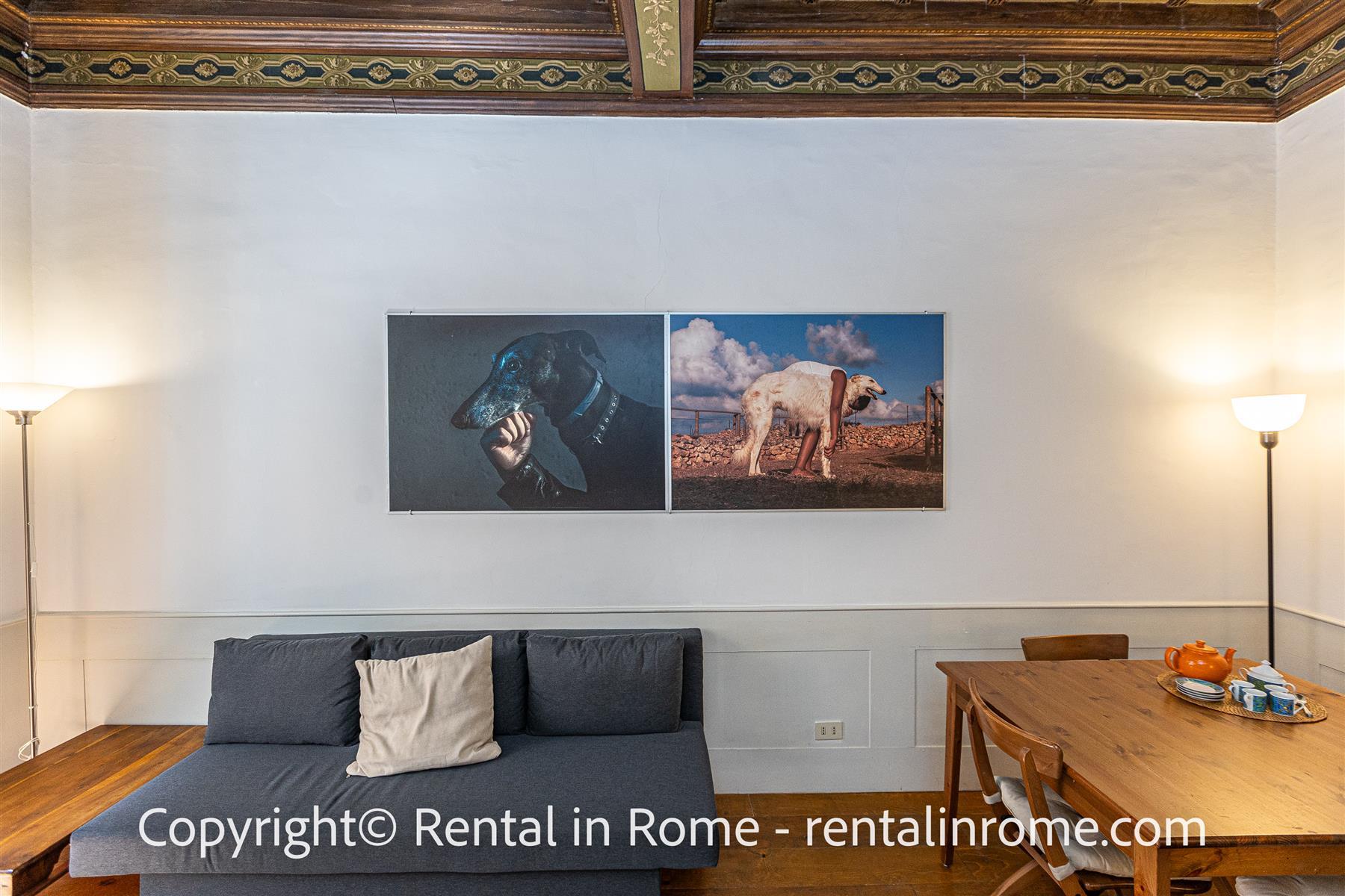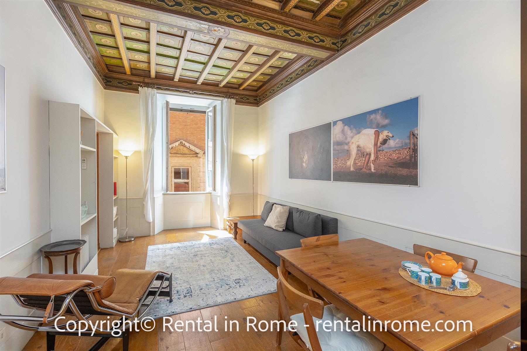 Beautiful apartment located in Via Frattina, one of the best known streets in the historic center of Rome, a few steps from the Spanish Steps, the Trevi Fountain, the Pantheon. The street is very famous for having become one of the most important Roman shopping streets, with a stronger vocation towards tailoring. The property is located on the second floor with lift of a very elegant building. Consisting of a double living room overlooking the wonderful Via Frattina, this room is equipped with sofas and a dining table, two double bedrooms and two bathrooms with shower, a fully equipped kitchen. The beautiful wooden coffered ceiling and parquet give a touch of elegance to this wonderful apartment, perfect for families or groups of friends who want to spend a short or medium-term stay in the heart of the Eternal City.
