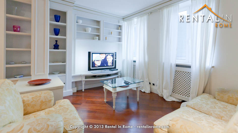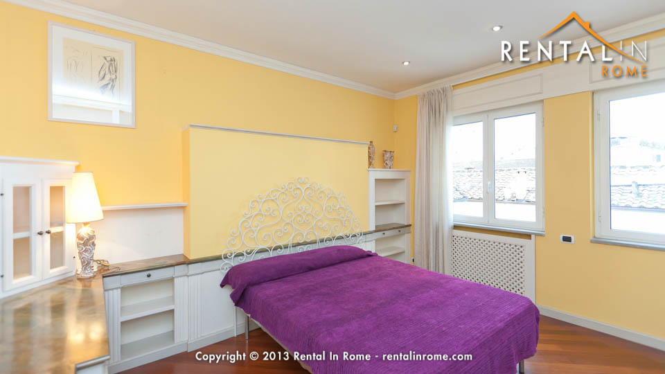 Wonderful 240 m² apartment located on the fourth floor with elevator of a palace on Via Margutta, close to the Spanish Steps, Piazza del Popolo and the boutiques of Via del Corso and Via Condotti. Become famous thanks to the movie “Roman holiday”, and location of an annual exhibition which makes it an open-air art gallery, Via Margutta is better known as the “artists’ street”, due to the many famous artists who have lived there- among them Federico Fellini, Giulietta Masina, Anna Magnani, Giorgio de Chirico and Pericle Fazzini, the latter being one of the main Italian painters and sculptors of the XX Century, who lived in this house until his death, in 1987. Finely furnished in a classic style, the apartment is developed on two levels: the bottom one is comprised of a large and bright living room with dining area, a comfortable double bedroom with en-suite bathroom with shower, a bedroom with an armchair-bed and en-suite bathroom with shower, a fully equipped kitchen with balcony and a toilet; the upper level, accessible through an internal staircase, is composed by a second living room, a big balcony with table and chairs and two double bedrooms, each equipped with en-suite bathroom (one with shower, one with bath-tub). Balconies and windows of both levels offer magnificent partial views over the church of Trinità dei Monti and the nearby roofs. Amenities (including air conditioning, LCD TV, wi-fi and washing machine) and the quiet and exclusive location in the heart of the historical centre make this apartment a perfect solution for a great vacation in the Eternal City.