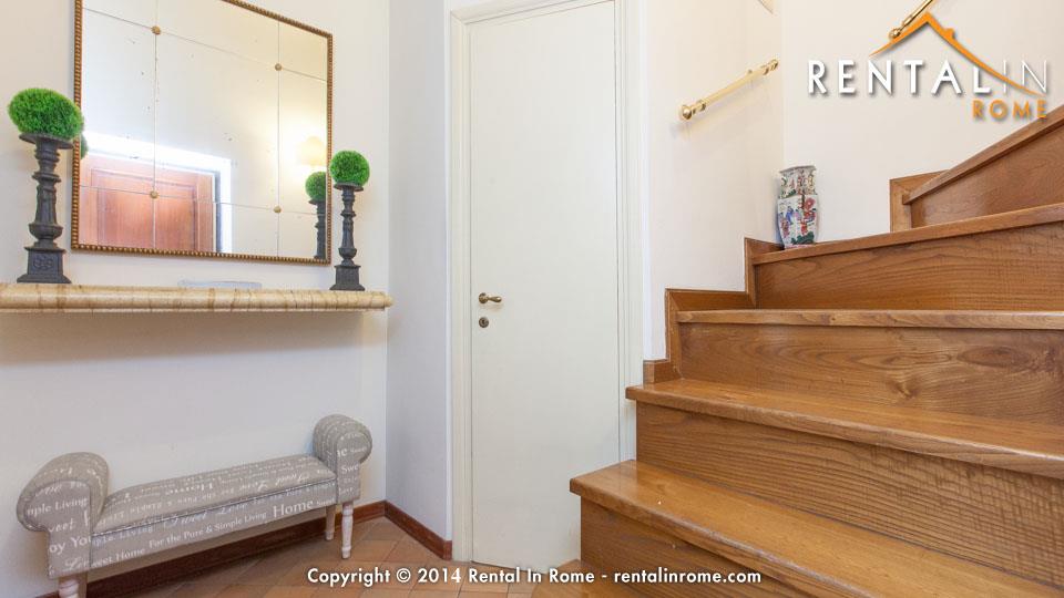 Cozy apartment located on the fourth floor of a building with elevator on Via Rasella, in the heart of downtown, a few steps away from the Trevi Fountain and the Quirinale Palace, and close to the Spanish Steps, Villa Borghese public park and the boutiques of Via del Corso. Finely furnished and characterized by original architectural elements, such as the oak beamed ceilings, it is developed on two levels: the lower level is comprised of a comfortable double bedroom with en-suite bathroom with bath-tub, a balcony and a practical walk-in wardrobe; the upper level, reachable through a staircase, is composed by a fully equipped kitchen, a dining area, a living room with fireplace and sofa bed and a beautiful terrace with hydro-massage tub, ideal to relax in the sun or to dine in the open air. Amenities, which include air conditioning, wifi and satellite LED TV and the exclusive and well-connected location (Line A Subway station BARBERINI is at about 150 meters) make it perfect for a pleasant stay in the Capital City.